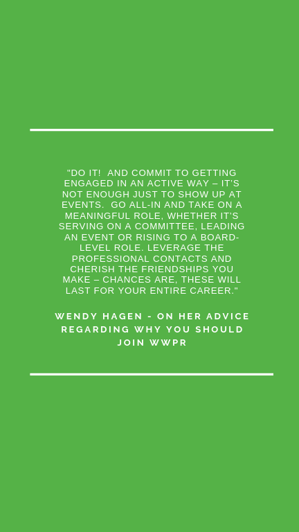 [caption id="attachment_7715" align="alignleft" width="300"]Wendy Hagen Headshot Wendy Hagen, 2018 Woman of the Year Award Winner Photo Credit: Headshots by Elliott O'Donovan -[/caption] How I Got Started  Prior to starting her own, Wendy was the EVP/Partner with Porter Novelli where she ran the strategic planning and research group.  When leaving Porter in 2009, she wanted to focus on the aspect of the work she was most passionate about: brand strategy. Wendy then started consulting with nonprofits on refreshing their branding and messaging based on solid research insights. Soon after, she launched her own business and was hired by a former client to assist his association in their search for a full-service agency to launch a $20-million national campaign. Currently, she now works with clients on agency searches. In addition, she has been fortunate to have a flourishing consulting business and work with challenging clients and outstanding creative, research and PR partners.  Challenges in Public Relations  What Wendy finds most challenging, in a good way, is digging through tons of research and uncovering audience insights that lead to a compelling strategy, value proposition and messaging.  What she doesn’t find most challenging in a not-so-good way is running out of toner cartridges and having to run to Staples in the middle of a project. The Benefits of Joining WWPR Wendy joined WWPR after the honor of being selected as the 2018 Woman of the Year.  While she was certainly aware of WWPR and had many friends and colleagues who are active in the organization, it wasn’t until the Woman of the Year event that she truly recognized what an extraordinary group this was. She was inspired by the other accomplished WoY finalists, Kate Perrin and Gloria Rodriguez, and their tremendous dedication to the profession and to helping women prosper in PR.  And, she has been incredibly impressed with the commitment and engagement of the WWPR Board and professional community.  2018 WWPR's Woman of the Year (WOY) Award  As anyone could tell from her stunned reaction and acceptance speech, Wendy was delightfully surprised to have been selected as Woman of the Year by WWPR.  She was thrilled to be recognized, having had a rather non-traditional career path that combined a background in advertising, client-side marketing, PR firm leadership and launching her own branding consultancy. To her, it was so gratifying to receive so many well wishes from friends and colleagues who celebrated this award right along with her.. Wendy is so grateful to WWPR for this honor – it meant so much to her. Involvement with Other Professional Organizations Wendy has always been a believer in engaging in professional organizations and networking with peers. Throughout her career, she’s been active in and served on the Boards of the Advertising Federation of DC, American Marketing Association (DC Chapter), and served on the Steering Committee for Advertising Week DC.  For the past year, she has been mentoring a young woman who’s building her communications career, and gaining as much from the experience and exchange of ideas as she (hopefully) is! Keeping up with the latest PR Trends  Wendy keeps up with the trades (PR and advertising) and makes an effort to connect with her personal network of professionals across a variety of disciplines, from researchers to public affairs professionals; graphic designers to digital strategists. She loves reading about award-winning communications campaigns, and always gains new insights by reading about winning submissions whether it’s PRWeek Awards, THOTH, Sabre Awards or Effie’s.  Wendy geeks out on books about strategy, creativity and behavior change, and always find cool new ideas in Fast Company magazine.  Trends Happening in Communications There’s more focus on research-based strategy and insight and much more demand for measurement and evaluation.  But, the one thing that hasn’t changed is the importance of storytelling and creating a unified brand and compelling narrative. Clients expect agency partners to be proactive, strategic and integrated communications experts.   Favorite Things to do in the DMV Wendy lives in Dupont Circle and is a big fan of walking all over the city (especially when she can bring her dog, Rufus, along). She and her husband recently tried electric scooters for the first time (so fun!). She has also served on the Board of Woolly Mammoth Theatre for ten years and absolutely loves going to see provocative new plays that speak to issues of today and makes one think to get out of your comfort zone.  Advice to Communications Professionals She believes that all communications professionals need to be students of culture – to stay curious and try to gain an understanding of what’s going on in our neighborhood, our city and in society in general.  Wendy recently read Robin DeAngelo’s book, “White Fragility,” about the discomfort many white Americans feel about confronting racism. She looks forward to participating in an Equity, Diversity and Inclusion workshop this Fall and feels that this profession still has a long way to go in terms of inclusivity and representation.