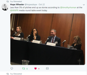 Past President, WWPR[/caption] Skilled moderator Lisa Matthews (@LisaNMatthews), Assignment Manager for the Associated Press in DC, returned to guide an insightful panel discussion with four reporters at WWPR’s Annual Media Roundtable lunch on October 22. The American Chemical Society hosted this sellout event. Panelists Tim Homan (@timothyrhoman), News Editor for The Hill; Jen Judson (@JenJudson), Reporter for Defense News; Andrea McCarren (@andreamccarren), Reporter for WUSA9; and Scarlette Whyte, (@ScarletteWhyte), Senior Producer for The Lead with Jake Tapper on CNN provided feedback on how to contact them, how best to pitch them, how to cultivate productive media relationships, and much more. Starting with when to pitch and how much lead time to provide on a story, the panelists all had different answers. Some of these differences are due to their schedules and work style, while others are due to print vs television. For example, Jen Judson frequently travels internationally to cover stories, so often is not available for pitches. For print, more lead time helps the reporters research a story. However, TV coverage is planned very quickly so short lead times are expected. They all agreed that they are overwhelmed by email so a pitch must be very alluring to make it through to even be read. “You have three or four words to hook me,” explained Andrea McCarren. A targeted subject line can help attract attention, according to Jen Judson. This means it speaks to issues she is covering or provides compelling news. Panelists at the Media Roundtable 2018 Do you want to beat the odds? Tim Homan explained that “less than 5% of pitches actually end up as stories.” It helps to do your research on reporters and follow their social media accounts. This will give you more information on what they are reporting on and when they may be interested in information or experts for stories. Focus on a news hook when you pitch and why the story is relevant to the reporter you are contacting. When you’re pitching, have everything ready. Know your spokeperson’s availability for interviews. Provide materials (such as data or infographics) right up front. Consider it a package that needs to be ready the instant a reporter may respond. Many reporters also like a human connection to a story or a “real person” who can be interviewed about the issue or impact on their lives. One good tip is to consider pitching during down times, like August, weekends, or over the holidays. Outlets may be looking for content and providing a good story to them when they need it will be remembered. Scarlette Whyte also noted that her show likes anniversary stories for reflecting on milestone moments. Alexa Tahan Media Roundtable Tweet All of the panelists are open to cultivating relationships with public relations professionals. Andrea McCarren schedules many meetings per week to get to know communicators, research possible stories, and build her contacts. She noted: “You need to befriend us when you don’t need anything.” Perhaps the best advice came from Nigel, the service dog Andrea McCarren is training for a military veteran, as he demonstrated quiet patience sitting beside her throughout the discussion. Looking dapper in a tuxedo tie, he showcased how PR pros need to patiently persist in their media outreach.